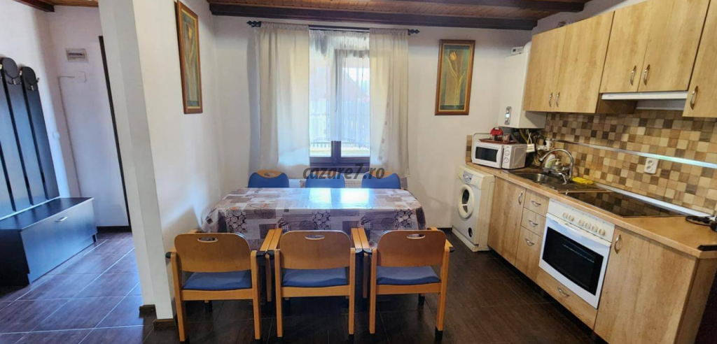 Bucataria este utilata complet, avand plita electrica, cuptor, cuptor cu microunde, expressor cafea, frigider. La etaj sunt 2 dormitoare, fiecare avand spatiu de dressing, TV in camera si iesire pe terasa.