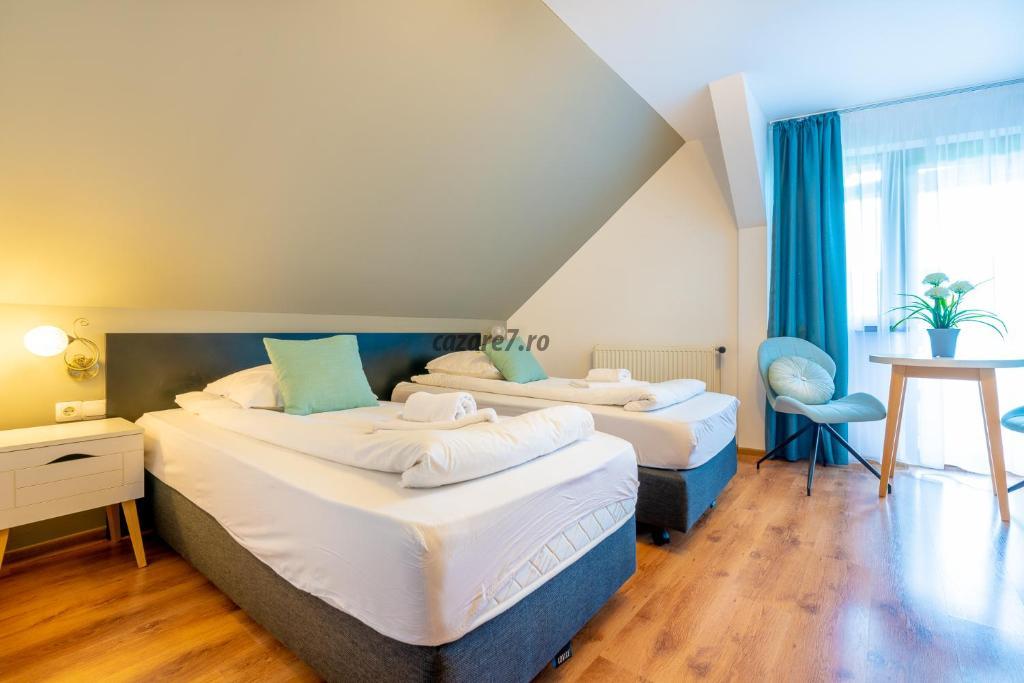Fiecare camera cu patrui matrimoniale sunt amenajate confortabil, fiecare avand o personalitate proprie prin designul interior.