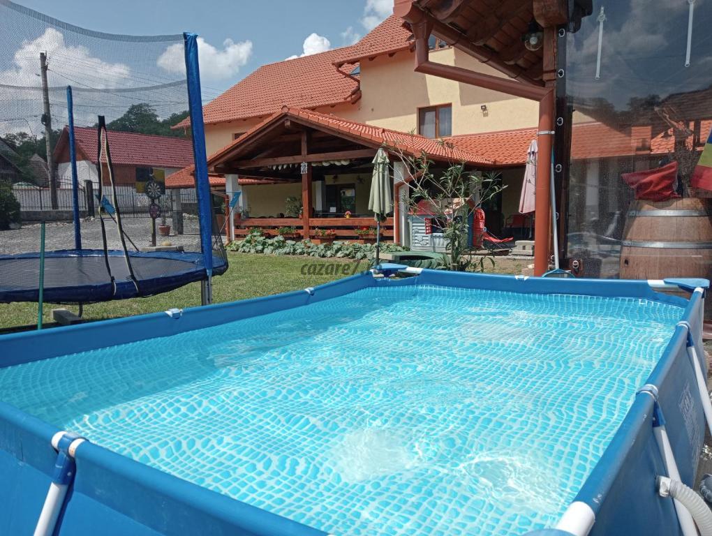 2. Casuta de gradina, roata cu nisip si trambulina, piscina in aer liber(vara)