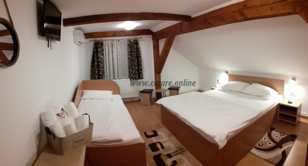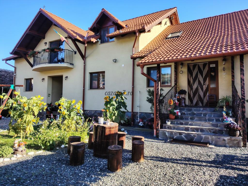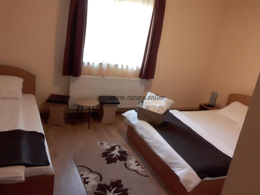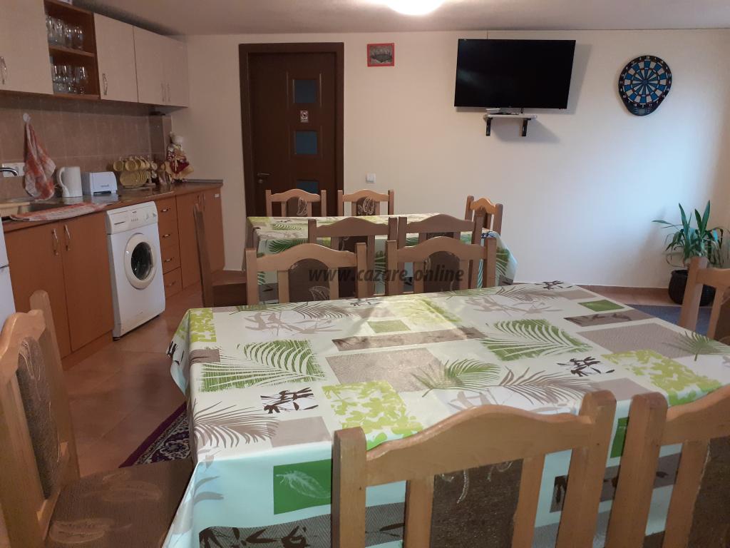 Suntem amplasati intr-o zona linistita si oferim turistilor intreg confortul a 7 camere cu bai proprii ( 6 camere triple si 1 camera dubla ) cu o capacitate maxima de 23 persoane (cu pat suplimentar ), centrala proprie de incalzire - apa calda permanenta, tv- cablu tv, Internet Wi-fi gratuit, 3 bucatarii complet utilate amplasate pe fiecare etaj, parcare interioara supravegheata video, terasa acoperita pentru gratar, disc, ceaun.