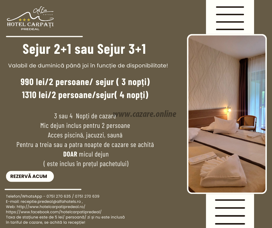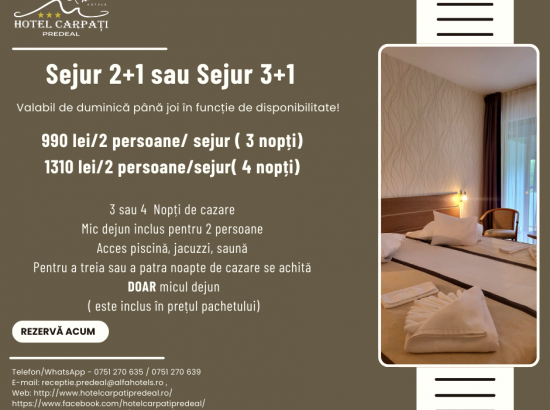 Pentru a treia sau a patra noapte de cazare se achită DOAR micul dejun ( este inclus în prețul pachetului).