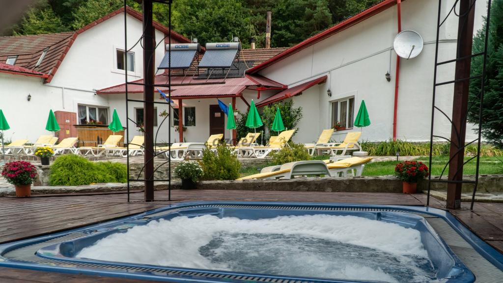 Va puteti relaxa pe terasa noastra de 70 de locuri sau de ce nu, de o balaceala in piscina cu apa albastra si limpede, adanca de pana la 1,8 metri.