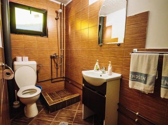 Pensiunea dispune de 8 camera, fiecare camera având grup sanitar propriu, o bucatarie complet utilata, o terasa ce ofera o priveliste de invidiat, un foisor cu semineu.