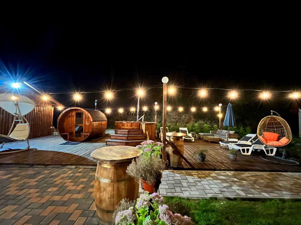 Grădina spațioasă, cele două terase din lemn, foișorul dotat cu grătar, cuptor, plită, afumătoare, spațiul de joacă pentru copii, creează o ambianță plăcută.