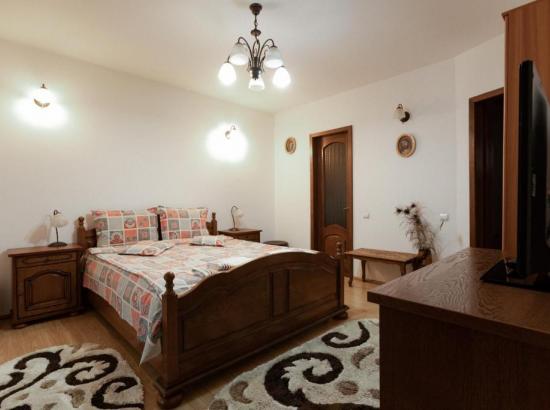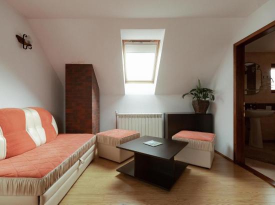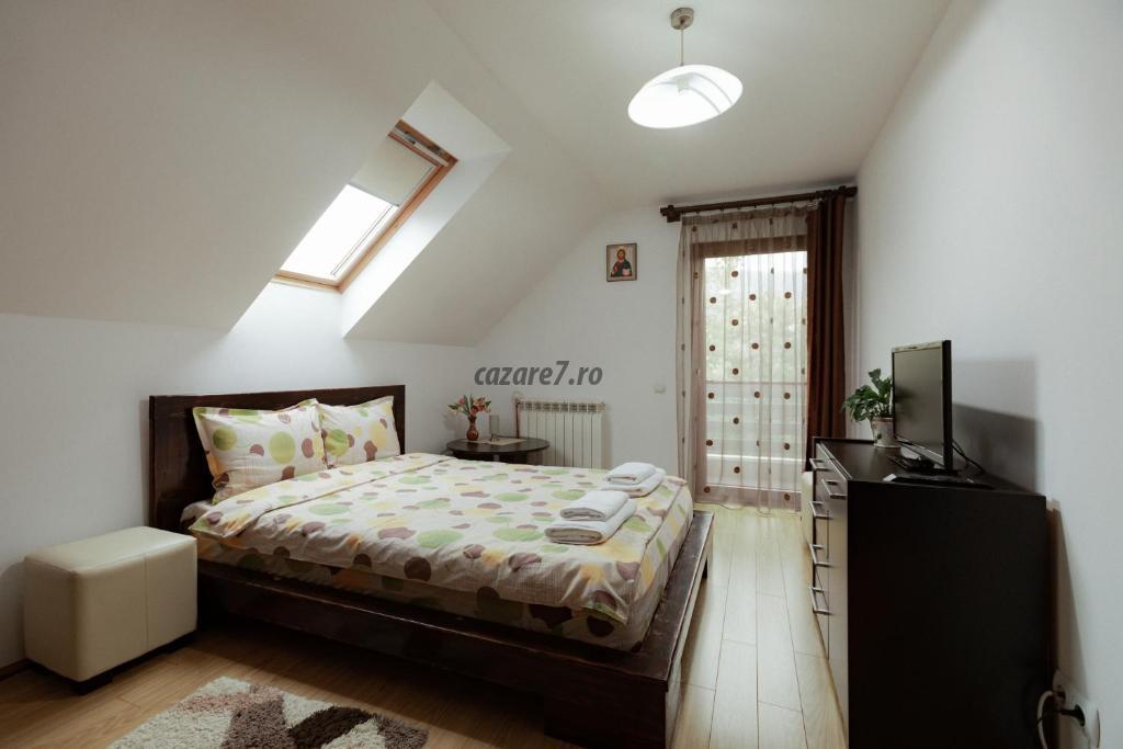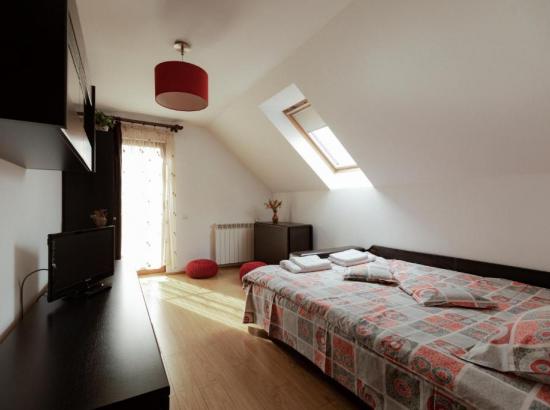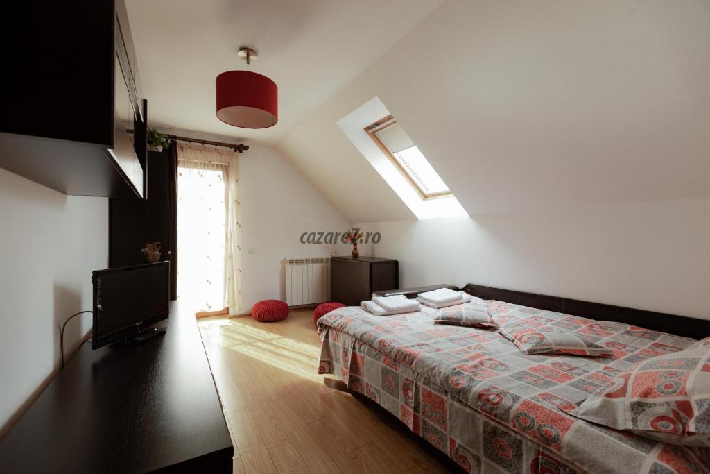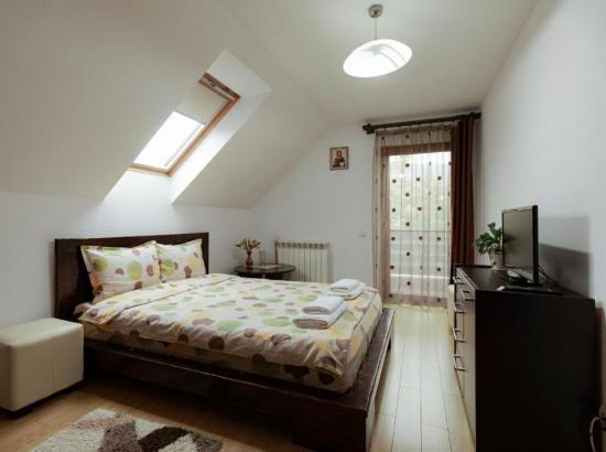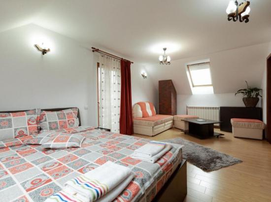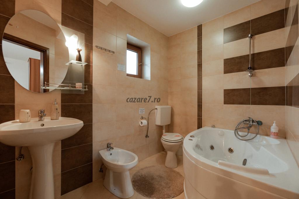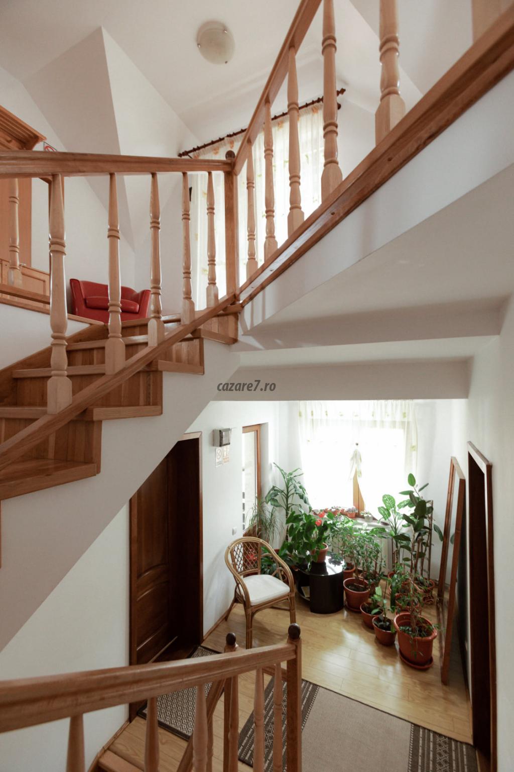 • la ultimul nivel – un etaj mansardat înalt, spaţios – este camera 4 dublă de lux, foarte generoasă, cu baie proprie și cadă pe colț, o canapea extensibilă dublă, de 1.3 m, potrivită pentru 1-2 copii sau chiar persoane adulte.